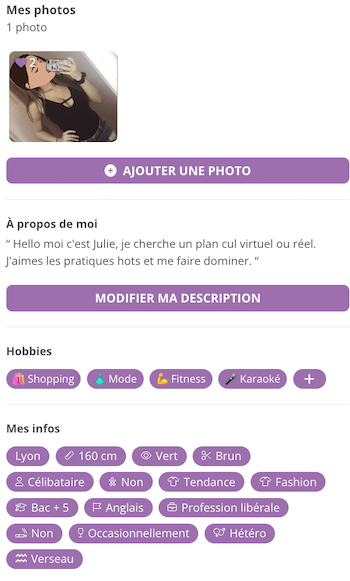 Sur J&M Plan Cul comme sur une majorité de plateforme de rencontres de nos jours, une partie de ton profil se rempli automatiquement en fonction des infos que tu donnes pendant ton inscription. Pour le reste, il te suffira de cocher les cases de tes hobbies si tu ne les as pas encore renseignés, de rajouter une photo et surtout de rajouter une description. Je le rabâche tout le temps mais la description quand t’es un mec c’est indispensable. Je vais le redire pour Jacquie & Michel Plan Cul. Particulièrement car il n’y a pas de cases ou de tags permettant de mettre en avant tes préférences sexuelles. Tout se joue donc sur tes photos, sur le “badge” que tu choisis à ton inscription : “rencontres coquines”, “rencontres calines” ou “rencontres torrides”, et sur ta description.