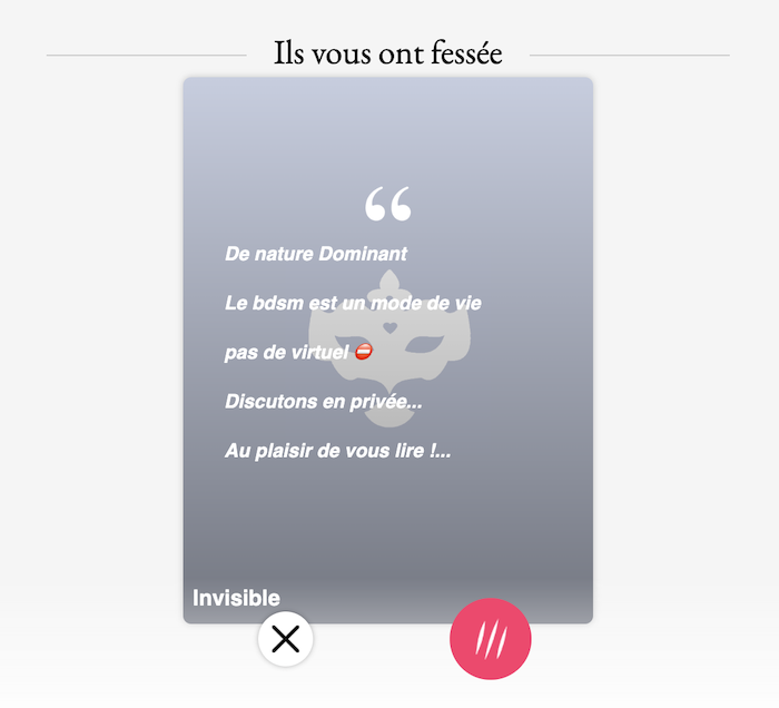Avant de commencer cet avis, je me permets un petit disclaimer (plutôt 2 disclailers) : 1. La communauté BDSM peut être intense donc ne t’inscris pas à la légère ni sans avoir fait des recherches. Chaque membre, chaque pratique a des fonctionnements bien particuliers et il faut les connaitre. 2. Ce sont des rôles qu’on ne prend pas à la légère : il y a des responsabilités à être soumis ou à être dominant. Particulièrement quand tu veux être un dom. Ça ne s’arrête pas à mettre une fessée au lit. Bien entendu, c’est beaucoup plus que ça, c’est être responsable du plaisir de sa (son) partenaire, c’est la pousser à ses limites mais savoir s’arrêter quand il le faut. Pour finir, c’est aussi être affectueux, attentionné, doux et sécurisant pour sa partenaire. Tu as la responsabilité du bien-être de sa partenaire entre tes mains en tant que dominant, fais attention.