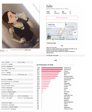 Quand tu arrives sur l’interface de ton profil, les premières informations que tu rentres sont les informations “basiques” : ton apparence physique, ta situation actuelle (amoureuse, académique, professionnelle…) et ta recherche. Parce qu’un site de rencontre BDSM est avant tout un site de rencontre et que la personnalité est très importante, tu as des catégories sur tes goûts musicaux, littéraires ou cinématographique. Tu as aussi des informations plus propres au milieu BDSM comme ton safeword mais aussi tes fantasmes, tes sextoys, ta dernière fois, tes secrets coquins.
